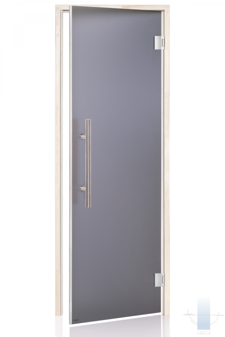 Saunas durvis tiek izgatavotas no 8 mm rūdīta stikla. Durvju komplektācija iespējama ar dažādu veidu tonētiem stikliem: pelēks, bronza. Saunas durvju kārba izgatavota no līmētas lapu koka koksnes. Saunas durvīm izmanto speciāli stikla vērtnēm paredzētas firmas “Abloy” eņģes KS-6540, FL-48; firmas “Abloy” fiksators “Abloy-4238”. Saunas durvīm ir kārbas blīvējums – karstumizturīgs silikons.