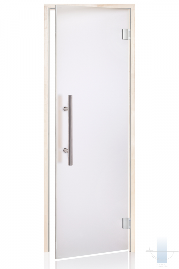 Saunas durvis tiek izgatavotas no 8 mm rūdīta stikla. Durvju komplektācija iespējama ar dažādu veidu tonētiem stikliem: pelēks, bronza. Saunas durvju kārba izgatavota no līmētas lapu koka koksnes. Saunas durvīm izmanto speciāli stikla vērtnēm paredzētas firmas “Abloy” eņģes KS-6540, FL-48; firmas “Abloy” fiksators “Abloy-4238”. Saunas durvīm ir kārbas blīvējums – karstumizturīgs silikons.