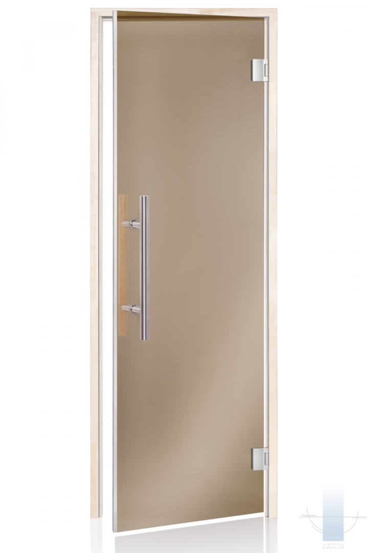 Saunas durvis tiek izgatavotas no 8 mm rūdīta stikla. Durvju komplektācija iespējama ar dažādu veidu tonētiem stikliem: pelēks, bronza. Saunas durvju kārba izgatavota no līmētas lapu koka koksnes. Saunas durvīm izmanto speciāli stikla vērtnēm paredzētas firmas “Abloy” eņģes KS-6540, FL-48; firmas “Abloy” fiksators “Abloy-4238”. Saunas durvīm ir kārbas blīvējums – karstumizturīgs silikons.