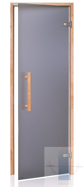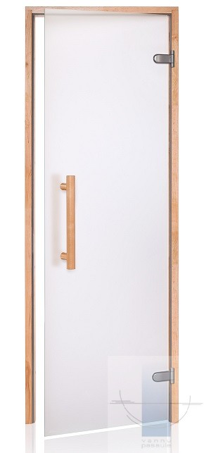 Saunas durvis tiek izgatavotas no 8 mm rūdīta stikla. Durvju komplektācija iespējama ar dažādu veidu tonētiem stikliem: pelēks, bronza, kā arī vairāku veidu dekoratīviem stikliem.Saunas durvju kārba izgatavota no līmētas lapu koka koksnes. Saunas durvīm izmanto speciāli stikla vērtnēm paredzētas firmas “Abloy” eņģes KS-6540, FL-48; firmas “Abloy” fiksators “Abloy-4238”. Saunas durvīm ir kārbas blīvējums – karstumizturīgs silikons.