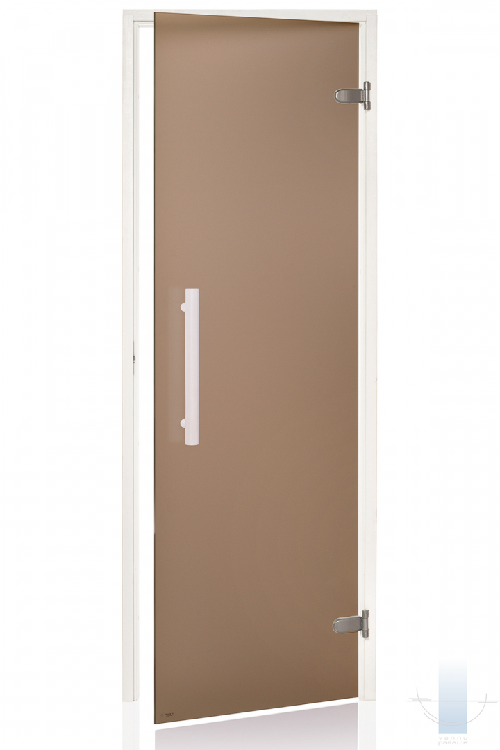 Saunas durvis tiek izgatavotas no 8 mm rūdīta stikla. Durvju komplektācija iespējama ar dažādu veidu tonētiem stikliem: pelēks, bronza.Saunas durvju kārba izgatavota no līmētas lapu koka koksnes. Saunas durvīm izmanto speciāli stikla vērtnēm paredzētas firmas “Abloy” eņģes KS-6540, FL-48; firmas “Abloy” fiksators “Abloy-4238”. Saunas durvīm ir kārbas blīvējums – karstumizturīgs silikons.