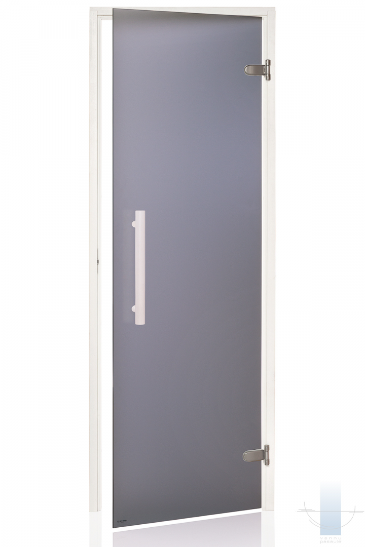 Saunas durvis tiek izgatavotas no 8 mm rūdīta stikla. Durvju komplektācija iespējama ar dažādu veidu tonētiem stikliem: pelēks, bronza.Saunas durvju kārba izgatavota no līmētas lapu koka koksnes. Saunas durvīm izmanto speciāli stikla vērtnēm paredzētas firmas “Abloy” eņģes KS-6540, FL-48; firmas “Abloy” fiksators “Abloy-4238”. Saunas durvīm ir kārbas blīvējums – karstumizturīgs silikons.