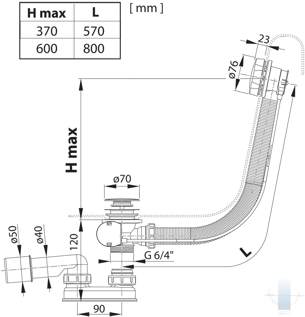 Vannas notekas komplekti ar pārplūdi 570 mm garumā ar Bowden notekas vadību. Notekas komplektā ietilpst arī sifons (smaku uztvērējs).