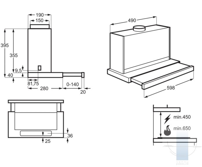 Iebūvējams skapītī, izvelkams, 60cm plats, lietojams ventilācijas un recirkulācijas režīmā, 3 darbības jaudas, 600 m3/h, 1 LED lampa, 2 mazgājami tauku filtri, trokšņu līmenis 46-74 dB(A)